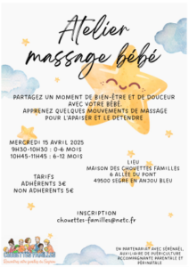 pour les parents de petits bébés, nous vous proposons un atelier massage avec Sérénaël (https://www.serenael.fr/).
