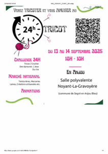 Le FLEP (Foyer Laïque d’Education Permanente) de Noyant la Gravoyère organise, en partenariat avec De Fil en Maine, un challenge tricot – crochet inédit dans le Maine-et-Loire : 24H Tricot ! à partir de 10h dans la salle communale.