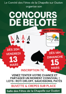 A partir de 14 heures, le comité des fêtes organisera un concours de belote, sans annonce, à la salle des fêtes communale.