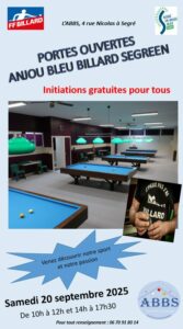 Le club de billard Français de Segré (l’ABBS) ouvre ses portes afin de faire découvrir au plus grand nombre cette discipline qui allie stratégie, adresse, technique mais qui est accessible à tous, de 7 à 77 ans et plus…