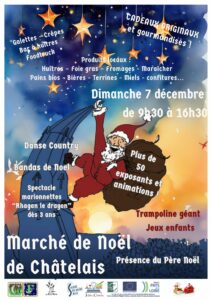 Le Père Noël sera présent pour des photos et friandises, dans son camion magique ou en promenade !Jeux, trampoline géant et animations tout au long de la journéeUne ambiance chaleureuse, conviviale et pleine de magie vous attend à Châtelais !