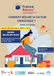 Un atelier organisé par Anjou Bleu Communauté destiné à tous les habitants souhaitant apprendre, via des gestes simples, à économiser l’énergie et à réduire sa facture de chauffage/électricité. Il sera animé par l’association Alisée dans le cadre du partenariat France Rénov.