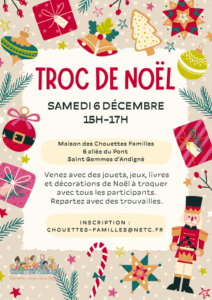 Jeux, jouets, livres et décorations de Noël à troquer.
