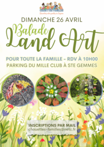 Tout au long de la balade, chacun récolte des éléments naturels. Merci d’apporter vos paniers. A l’issue de la balade, les créations éphémères seront réalisée au parc de Sainte Gemmes d’Andigné.