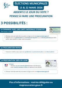 Une affiche est présente dans chaque mairie des communes déléguées afin de vous présenter la marche à suivre pour réaliser une demande de procuration.