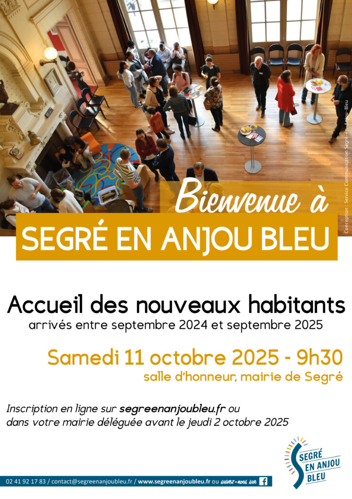 Les inscriptions se font sur le site https://www.segreenanjoubleu.fr/nouveaux-habitants-ceremonie-daccueil/ ou à l’accueil des mairies déléguées avant le jeudi 2 octobre 2025.