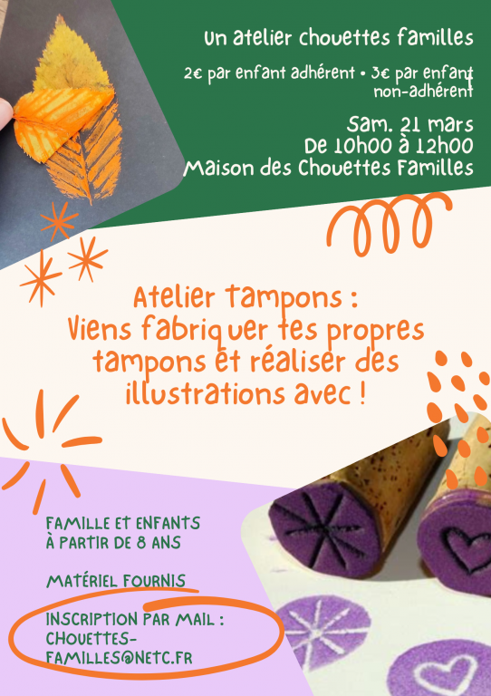 Atelier tampons pour les enfants à partir de 8 ans. Pour vous inscrire, envoyez-nous un message à : chouettes-familles@netc.fr