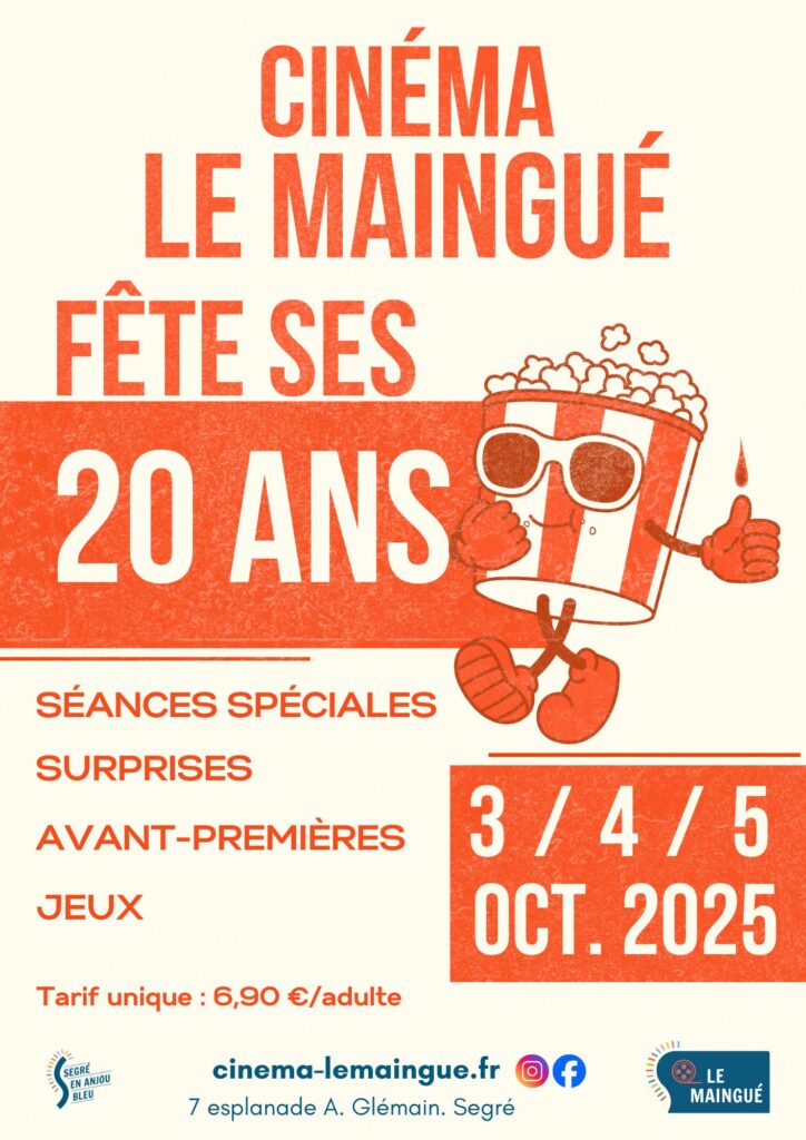 En 2025, votre cinema le Maingué fête ses 20 ans. Pour célébrer l’évènement en GRAND, rendez-vous les 3, 4 et 5 octobre 2025 !