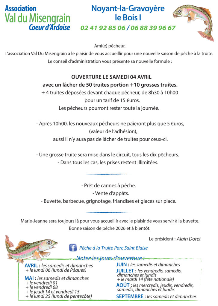 Tarif de 5€ après 10h30 (valeur de l’adhésion) sans lâché de truites.