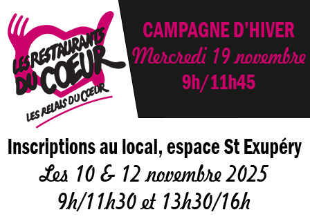 La Campagne d’Hiver des Restos du Coeur reprendra le mercredi 19 Novembre 2025 de 9h00 à 11h45 pour les communes extérieures et pour Segré.